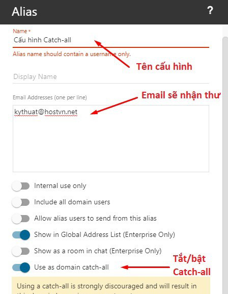 Bảng Alias hiện ra, bạn có thể thực hiện cấu hình Catch-all Email tại đây.