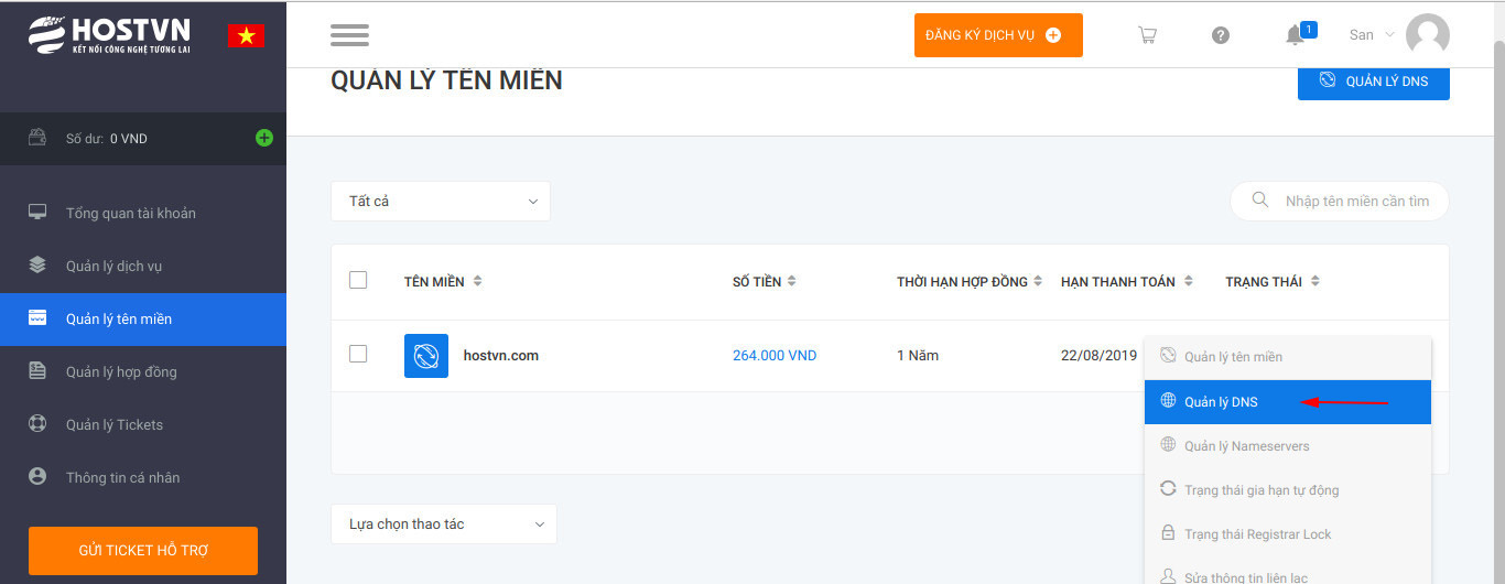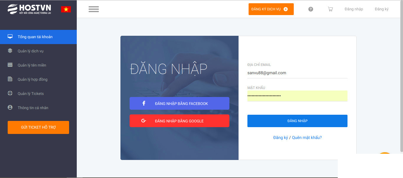 1. Đăng nhập vào trang quản lý tên miền của bạn. Nếu các bạn đăng ký tên miền và quản lý tên miền tại HOSTVN thì các bạn đăng nhập vào trang https://manage.hostvn.net