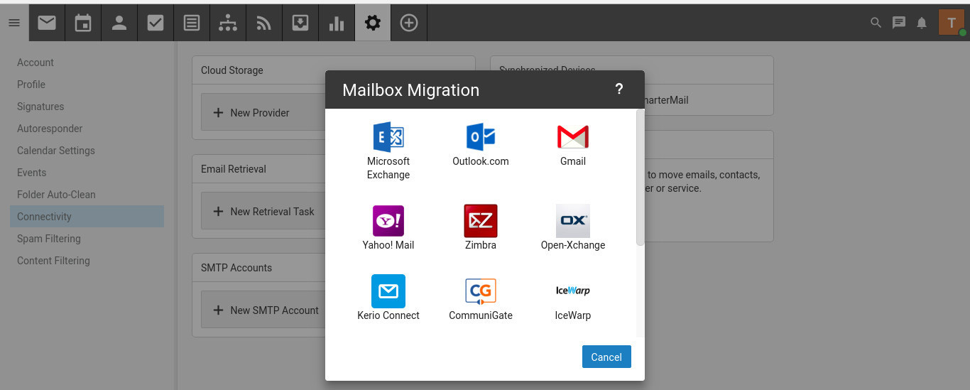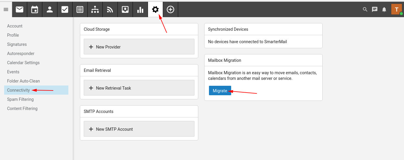 Bước 1: click chọn biểu tượng Settings (Cài đặt) -> Connectivity (Kết nối) -> Mailbox Migration (Di chuyển hòm thư) -> Migrate (Di chuyển)