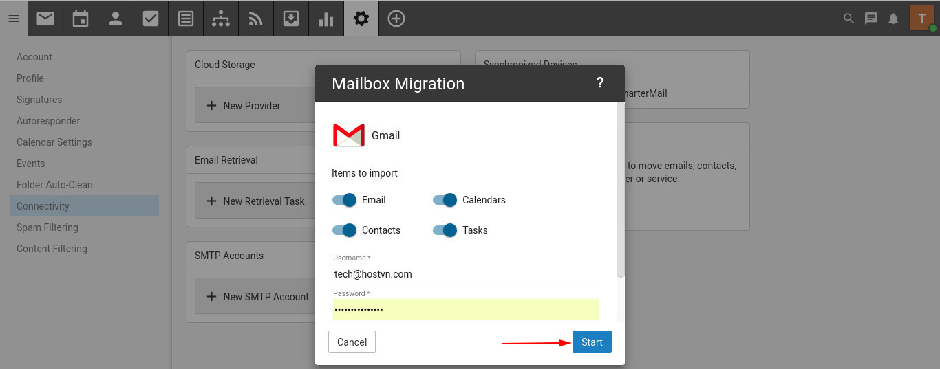 Sau khi điền đầy đủ thông tin các bạn bấm nút Start để bắt đầu quá trình chuyển thư. Bạn vui lòng giữ nguyên cửa sổ cho tới khi nhận được thông báo thành công.
