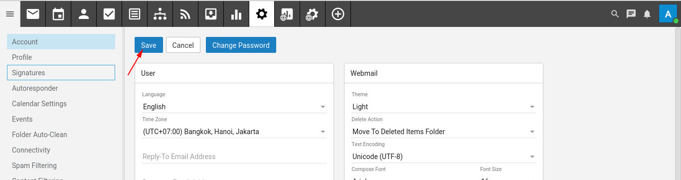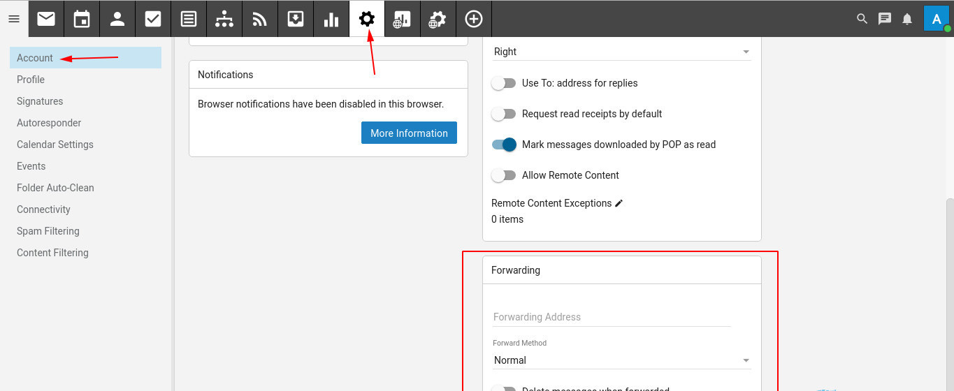 Trước tiên cần đăng nhập vào Webmail, sau đó lựa chọn Settings -> Account và chọn tiếp tab “Forwarding” như hình dưới đây. Bạn sẽ có 2 tùy chọn: