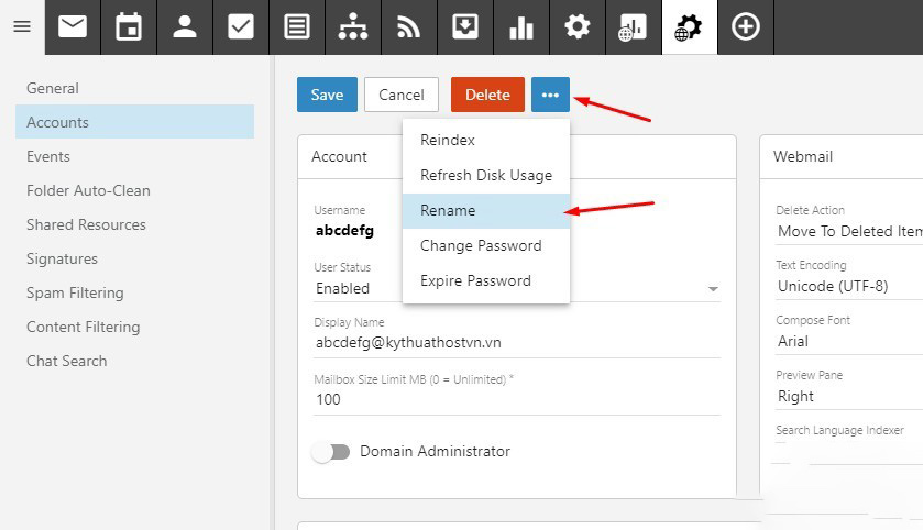 – Truy cập vào webmail đang sử dụng dịch vụ Email Business, bạn tìm đến Domain Settings, chọn Accounts và chỉnh sửa tài khoản mình muốn.