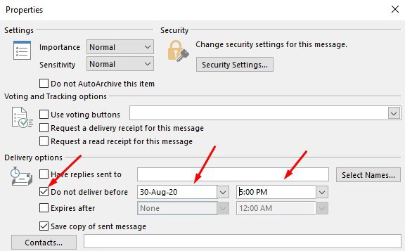 – Bạn chọn vào Do not Delivery Before (không gửi trước) và thiết lập ngày tháng, giờ gửi cho email này của bạn.