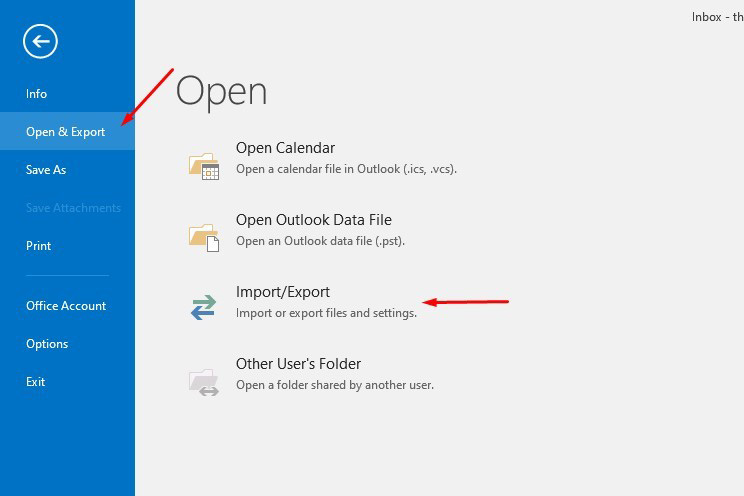 – Từ trang chính của Outlook của bạn và nhấp vào tab File. Màn hình Account Information xuất hiện, chọn Open & Export, chọn tiếp Import/Export.