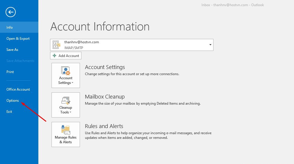 – Từ trang chính của Outlook của bạn và nhấp vào File và chọn Options.