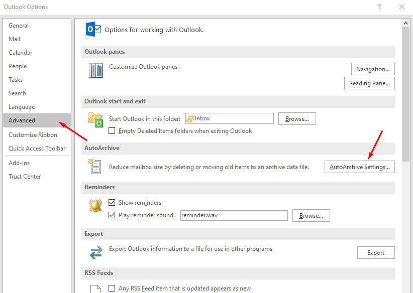 – Tại cửa sổ Outlook Options mở ra, chọn tab Advanced và tìm đến AutoArchive Settings…