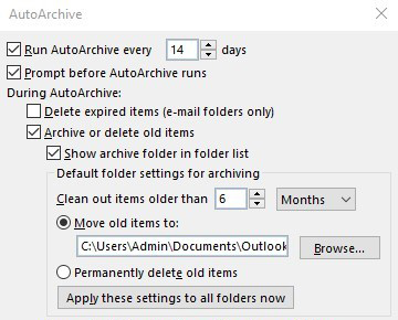 – Bảng AutoArchive hiện ra, bạn có thể tùy chọn các thông số để Outlook tiến hành tự động sao lưu.