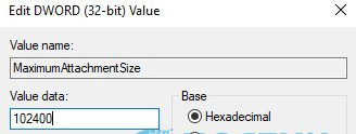 Bạn đặt tên cho file mới tạo là MaximumAttachmentSize, và điền vào ô Value sẽ trở là dung lượng tối đa cho phép đối với file đính kèm trong Outlook (Ví dụ 102400 là 100Mb)