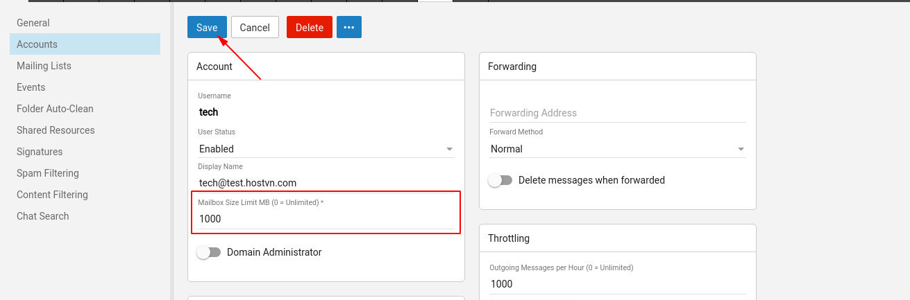 Tiến hành cập nhật thông số Mailbox Size Limit và bấm Save