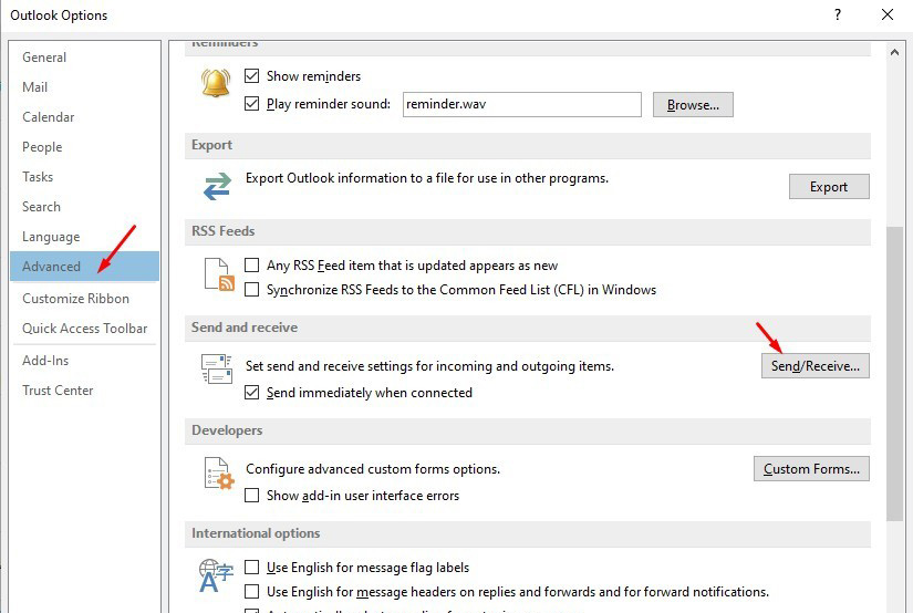 – Tại bảng Outlook Options, bạn tìm đến tab Advanced và chọn tiếp vào Send/Receive…