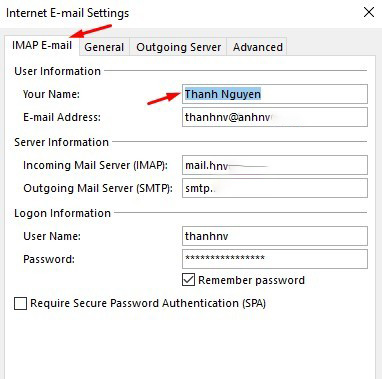 – Tại bảng Internet E-mail Settings, bạn tìm đến tab IMAP E-mail và đổi lại Your Name mà bạn muốn.