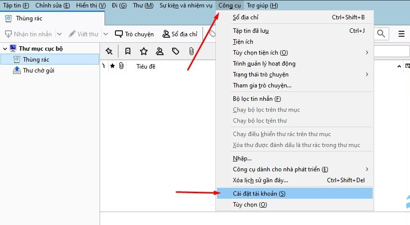 Tại bảng điều khiển chính của Thunderbird, bạn tìm đến Công cụ (Tools) và chọn Cài đặt tài khoản (Account Settings)