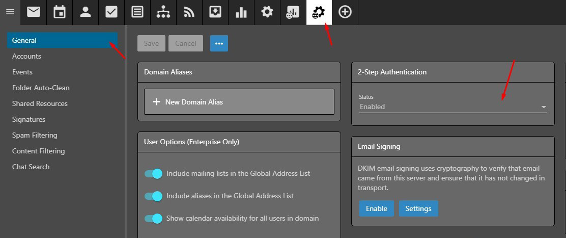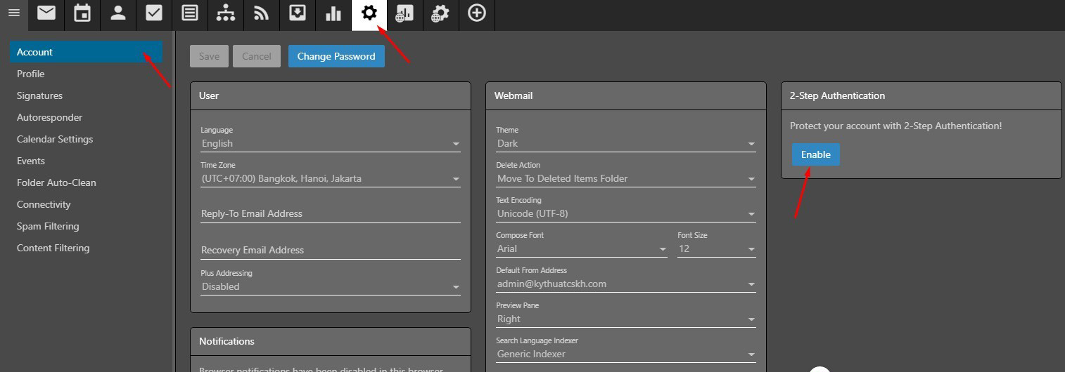 Truy cập vào webmail bằng tài khoản có quyền quản trị cao nhất, tìm đến trang Setting, chọn General và tiến hành Enable 2-Step Authentication