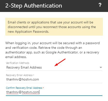 – Sau khi chọn vào Enable, tại cửa sổ 2-Step Authentiaction mở ra, bạn có thể chọn vào Recovery Email Address và điền thông tin Email sẽ nhận mã xác thực cho tài khoản Email Business của bạn.