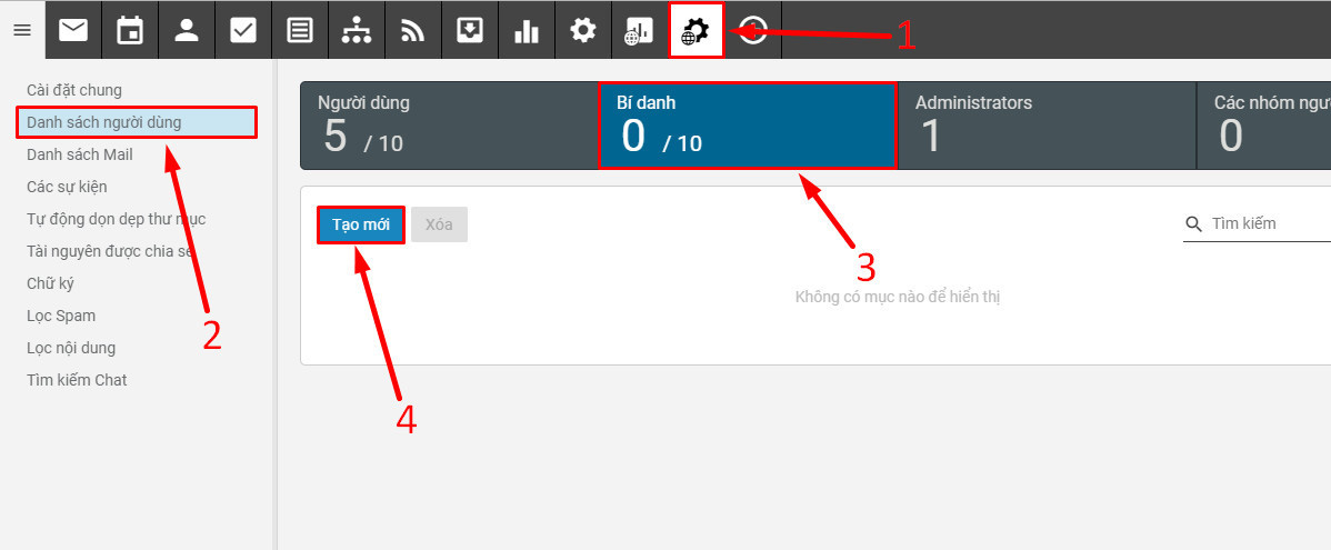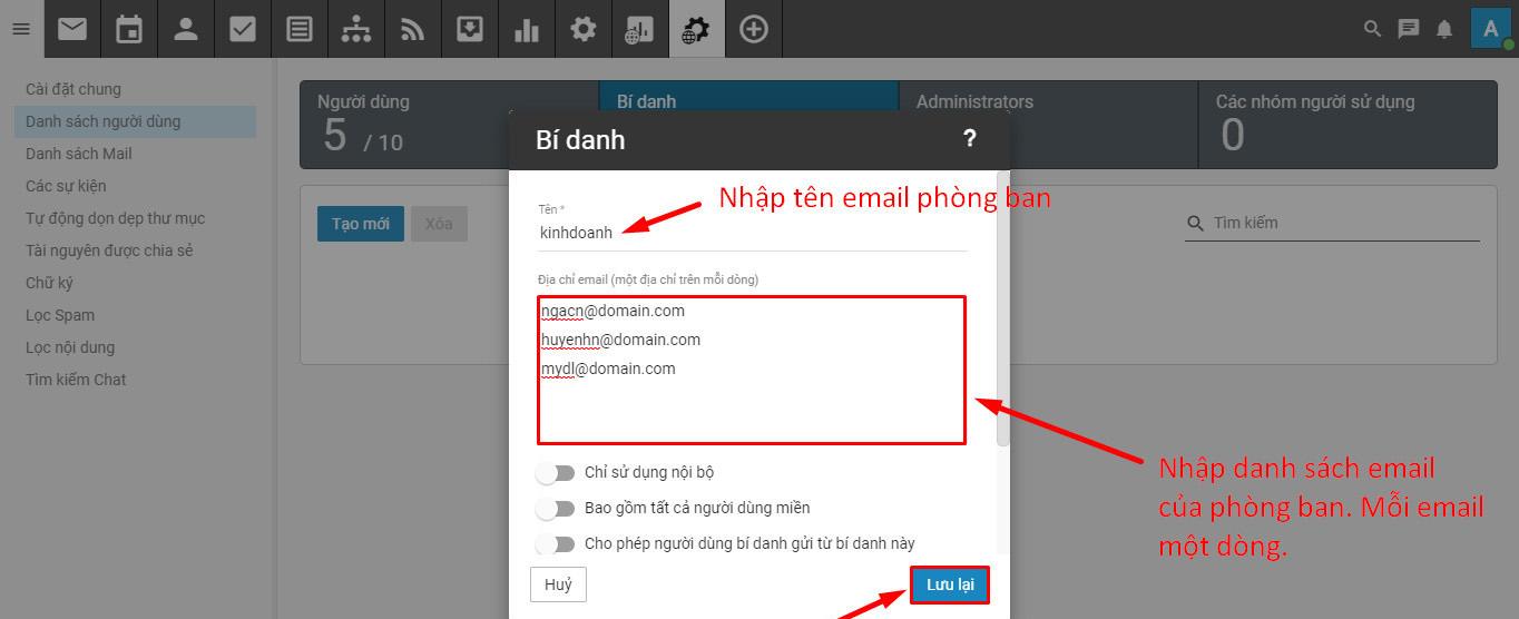 Sau đó bạn vào Cài đặt cho tên miền > Danh sách người dùng > Bí danh > Tạo mới như hình sau: